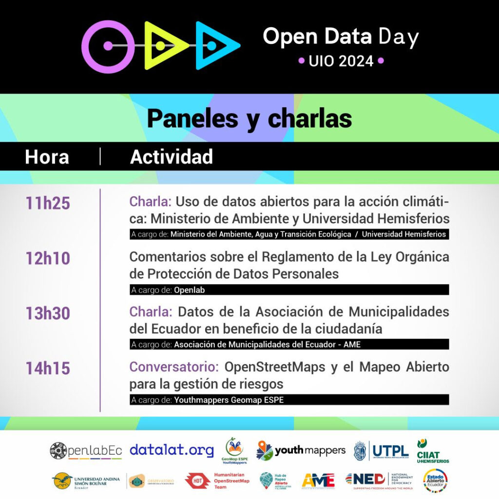 Sábado 9 de marzo de 2024. Como cierre de las actividades de la Semana de Datos Abiertos del Ecuador, las fundaciones Openlab Ecuador, Datalat, Youthmappers, la Univerisdad Hemisferios, la Asociación de Municipalidades Ecuatorianas, el Ministerio de Ambiente, Agua y Transición Ecológica, y el Observatorio de Ciberdatos y Tecnoseguridad de la Universidad Andina Simón Bolívar, realizarán la jornada «Open Data Day Quito 2024». En este encuentro abierto al público se debatirá sobre la importancia de los datos abiertos para los Objetivos de Desarrollo Sostenible, a través de diversas actividades relacionadas con el mapeo colaborativo, las herramientas de análisis de datos, la gobernanza de la inteligencia artificial, la ciencia abierta y la protección de datos personales. Además de datos municipales, datos con enfoque de género, datos ambientales y otros temas relacionados.