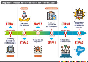 El proceso de cocreación del tercer plan de acción inició en febrero de 2025, liderado por el Grupo Núcleo con el compromiso de reafirmar los principios de Estado Abierto y fortalecer la colaboración entre todos los actores. Se desarrollaron con éxito las siguientes etapas: